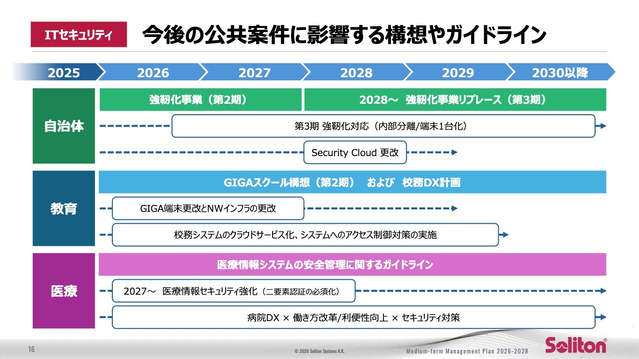 医療分野では、2027年までに医療情報システムの多要素認証必須化への対応が求められるほか、病院DXに広く関係するセキュリティ強化案件の需要が継続すると想定されています。