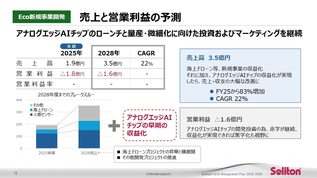 最後に、Eco新規事業開発です。2025年度の売上高1億9,000万円、営業利益マイナス1億8,000万円から、2028年度には売上高3億5,000万円、営業利益マイナス1億6,000万円まで改善する見込みです。売上のCAGRは22パーセントとなります。アナログエッジAIチップのローンチを核に、収益化の勢いを高め、次期の成長ドライバーに育てていくことを目指します。