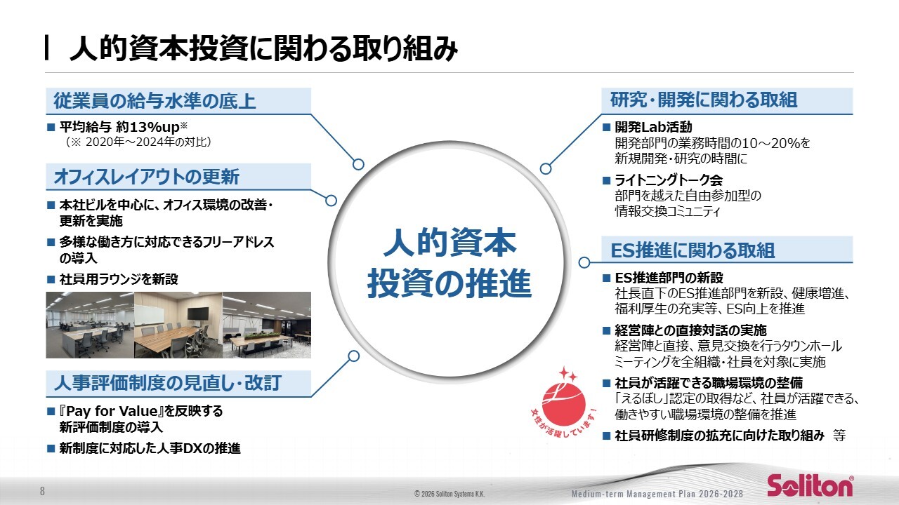 さらに、社長直下のES推進部門を新設し、健康増進や福利厚生の充実を図るとともに、タウンホールミーティングで社員との対話機会も増やしています。今後も人への投資を中心に据えることで、社員が成長し、その力が事業成長へとつながる好循環を継続して作っていきます。