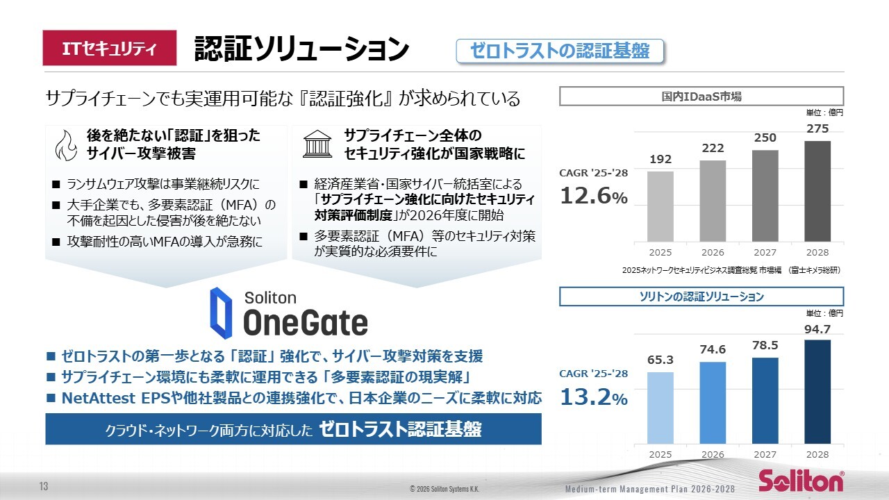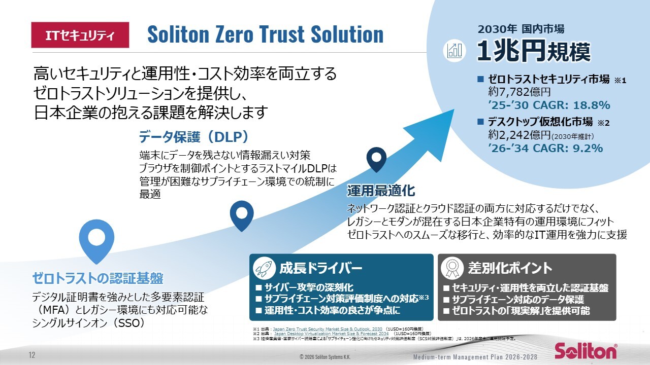 当社は、「Soliton OneGate」を中心とした多要素認証基盤と、レガシー環境にも対応可能な柔軟な連携性を強みとし、日本企業の実運用に適合する認証の「現実解」を提供できる立場にあります。認証領域における確かな需要と当社の優位性を組み合わせ、ゼロトラスト市場全体の成長を着実に牽引していきます。