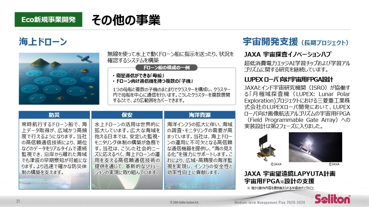 営業利益は引き続き赤字ですが、マイナス1億8,000万円からマイナス1億6,000万円へと改善し、収益化に向けた勢いを高めていきます。成長の鍵となるのは、アナログエッジAIチップの早期収益化と海上ドローンプロジェクトの横展開です。その他の研究テーマも含め、次世代の成長ドライバーを計画的に育成していきます。
