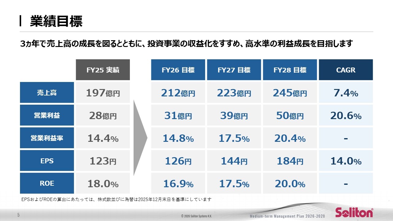 まず2025年度は、売上高197億円、営業利益28億円、営業利益率14.4パーセントという実績を記録しました。これを基準として、今後3年間にわたり事業構造をさらに強化し、成長スピードを加速させていきます。