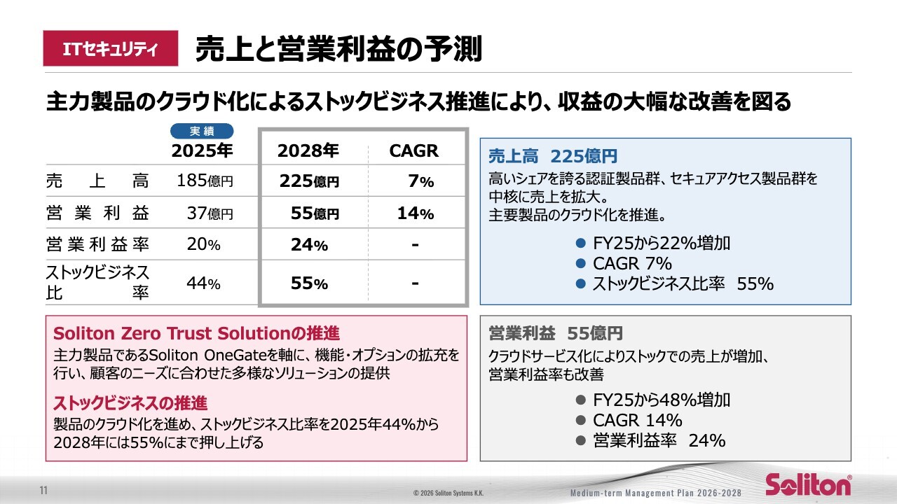 まず、ITセキュリティです。2025年度の売上高185億円、営業利益37億円から、2028年度には売上高225億円、営業利益55億円を目指しています。売上のCAGR(年平均成長率)は7パーセント、営業利益のCAGRは14パーセントと、売上以上に利益を伸ばす設計となっています。この分野では、「OneGate」を中心にクラウド化およびストック化を推進し、収益性の向上を図ります。