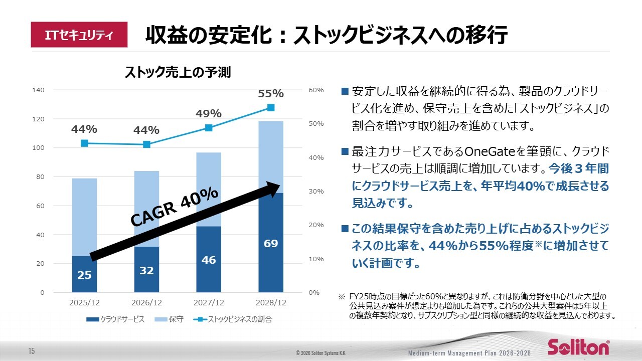 最注力のクラウドサービスである「Soliton OneGate」を中心に、クラウド売上は今後3年間で年平均40パーセントの成長を見込んでいます。これらのクラウド製品の売上と保守を含めたストック売上比率を高めることで、収益の安定性を強化し、利益率を着実に向上させます。