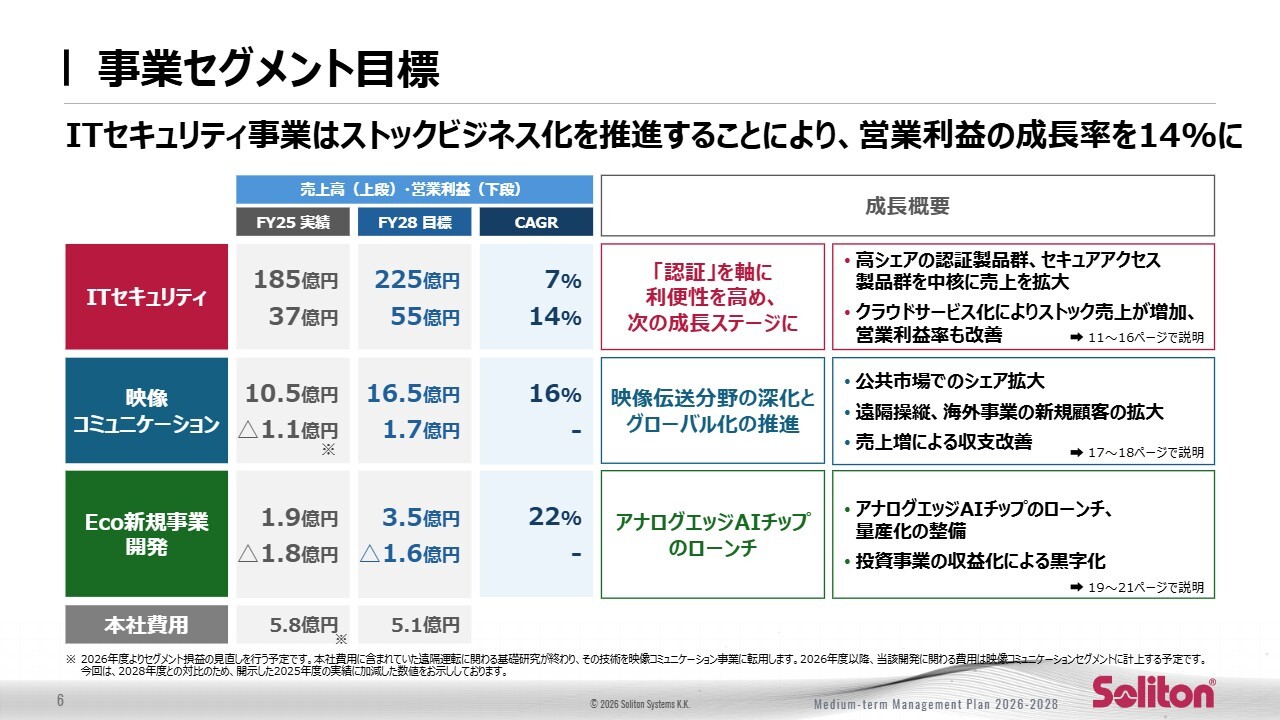先ほどご説明した業績目標を、3つの事業セグメントに分けてご説明します。