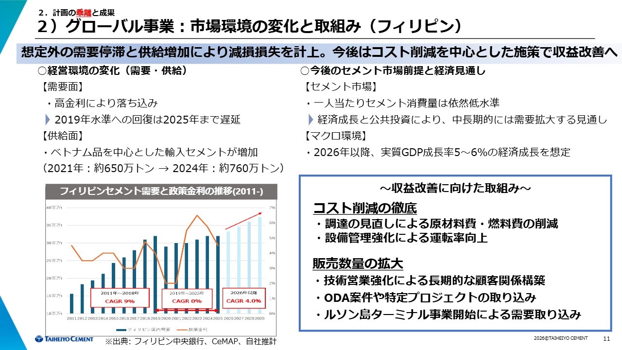 こうした状況の中で、当社としてはフィリピンのセメント市場について成長途上のマーケットであると考えています。1人当たりのセメント消費量は依然として低水準にとどまっていると理解しており、今後も経済成長や公共投資などにより、中長期的には需要が拡大すると認識しています。