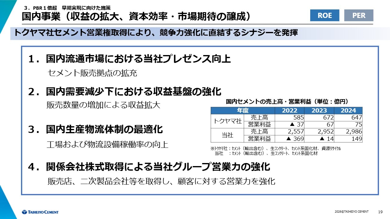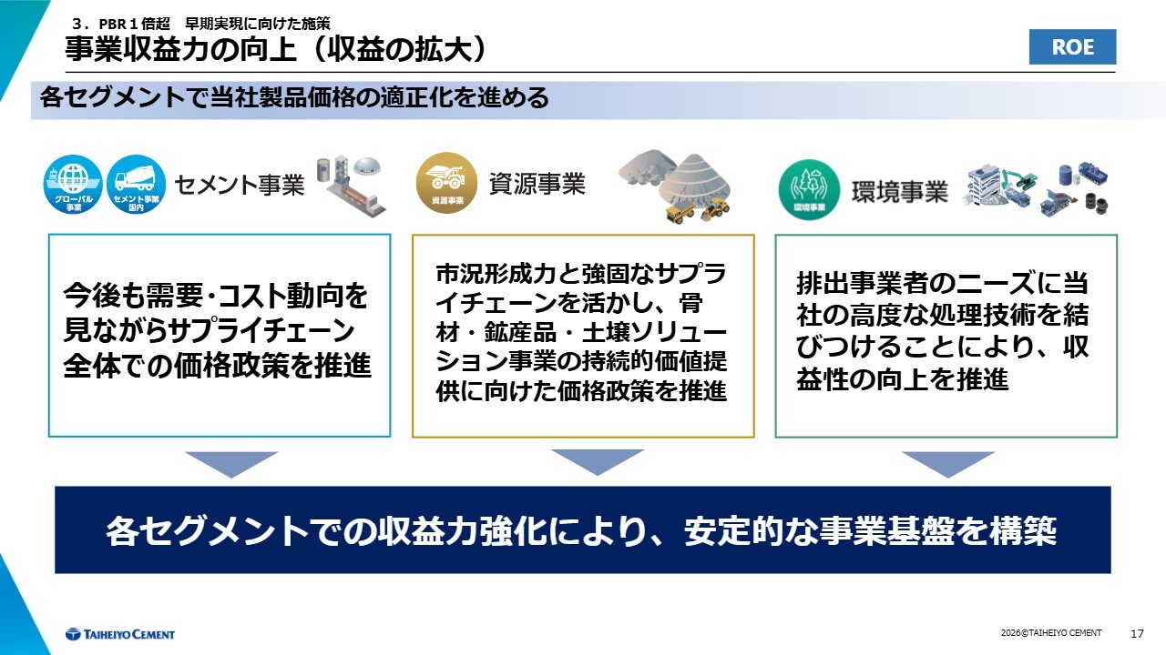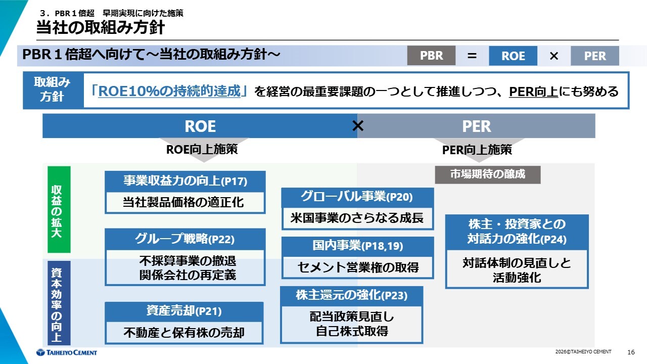 PBR1倍超に向けて、ROEについてご説明します。セメント事業については、これまでご説明したとおりです。