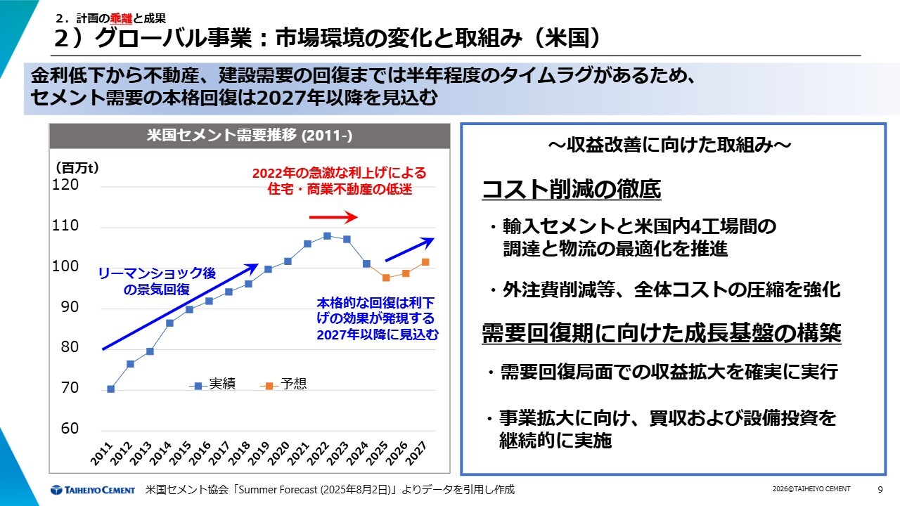 昨年度におけるトランプ関税や、現在のイラン情勢など、非常に不透明な状況が続いています。しかし、利下げ局面へ移行した後、一定のタイムラグを経てセメント需要が回復すると予想しています。