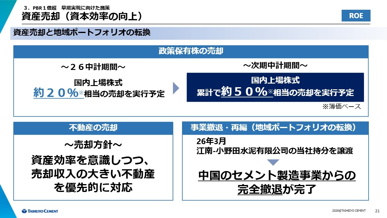 事業撤退・再編(地域ポートフォリオの転換)としては、2026年3月末にプレスリリースを発表しているとおり、江南-小野田水泥有限公司の当社持分を譲渡し、中国のセメント製造事業から完全撤退が完了しています。