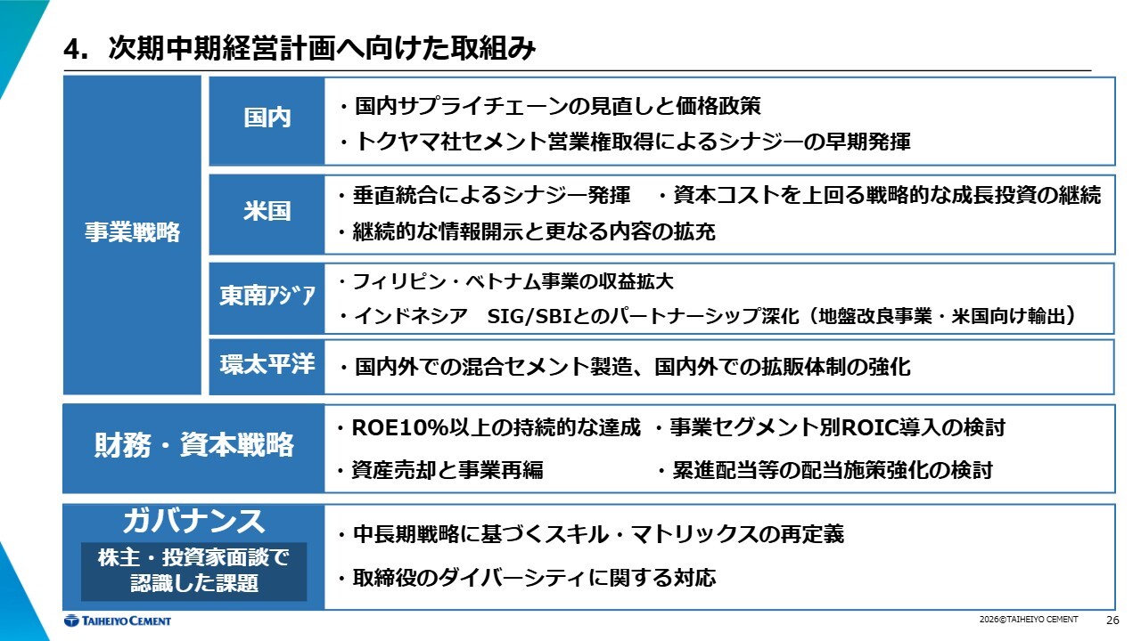 最後に、次期中期経営計画に向けた取り組みとして、問題および課題として認識している点についてご説明します。まず、国内においては、先ほどお話ししたトクヤマ社のセメント営業権によるシナジーの早期発揮が重要な鍵になると考えています。