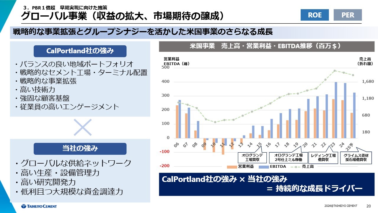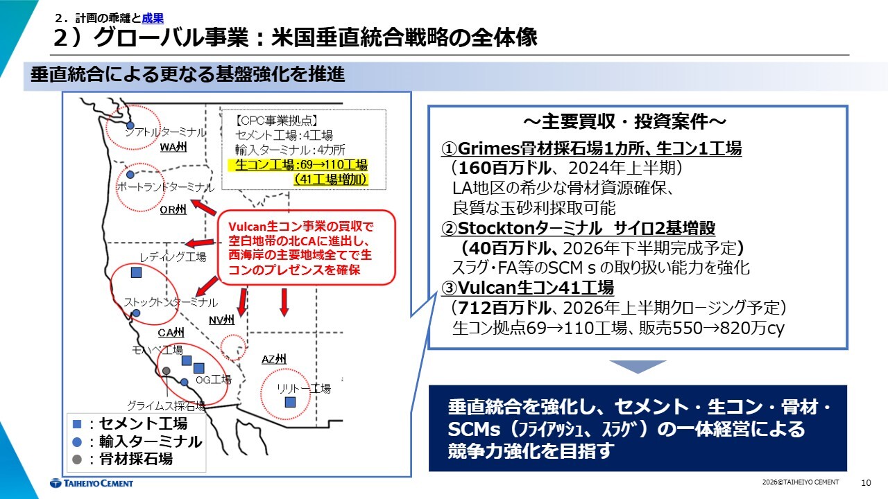 米国については、垂直統合の認可はまだ取得できていないものの、今年の下期以降にVulcan Materials社の生コン事業の買収効果を早期に発揮することを目指します。
