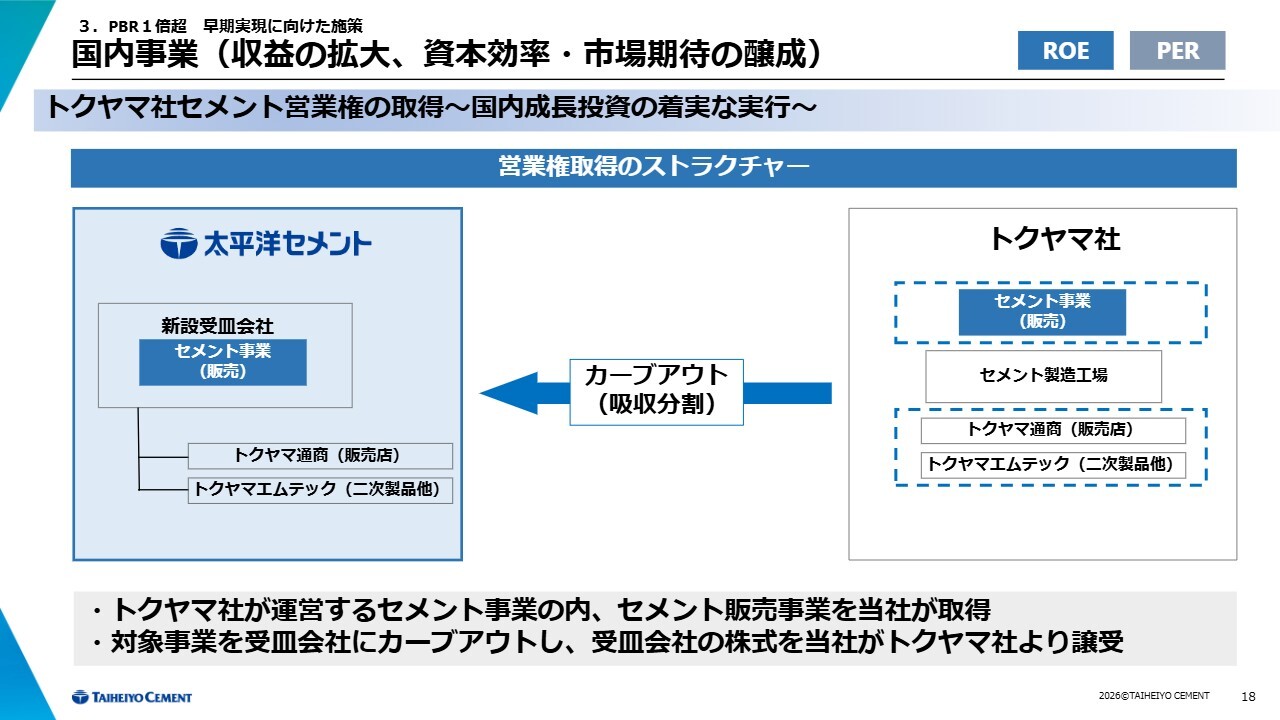 さらに、3月25日にプレスリリースした内容として、トクヤマ社のセメント営業権の取得があります。これは当初計画には含まれておらず、新たに加わっています。