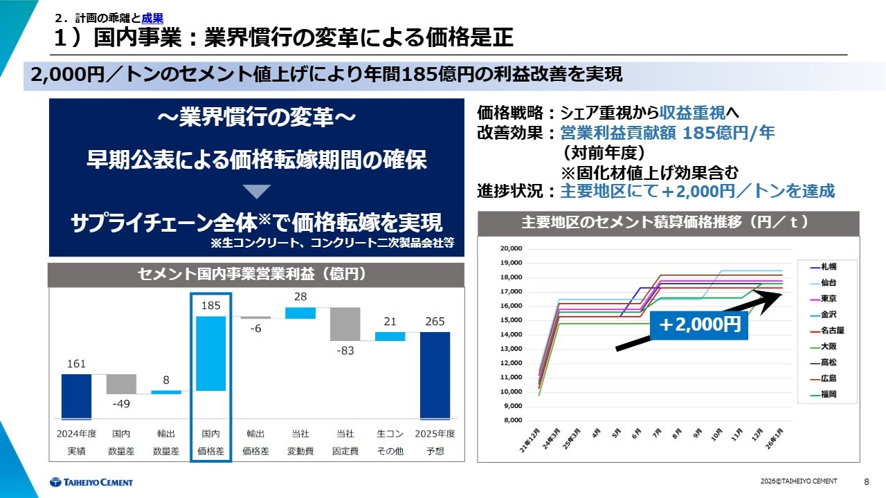 まず1つ目の強調したい点です。冒頭にお伝えしたとおり、国内需要は漸減傾向にありますが、トン当たり2,000円の値上げを昨年の春に打ち出し、ほぼ達成できています。この通年効果として、2025年度には年間185億円の利益改善を実現しています。