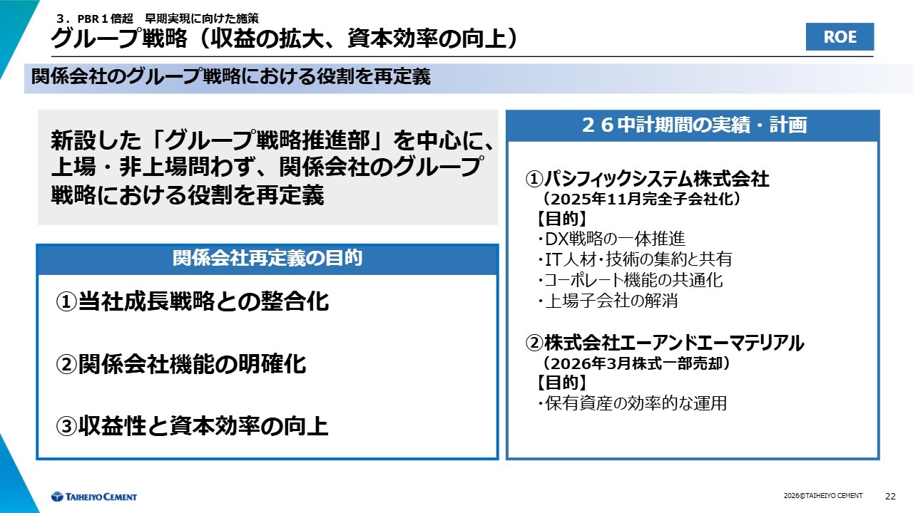 グループ戦略についてです。新設した「グループ戦略推進部」を中心に、上場・非上場を問わず、関係会社のグループ戦略における役割を再定義しています。具体的には、当社の成長戦略との整合性、関係会社の機能の明確化、収益性と資本効率の向上を目的に進めています。