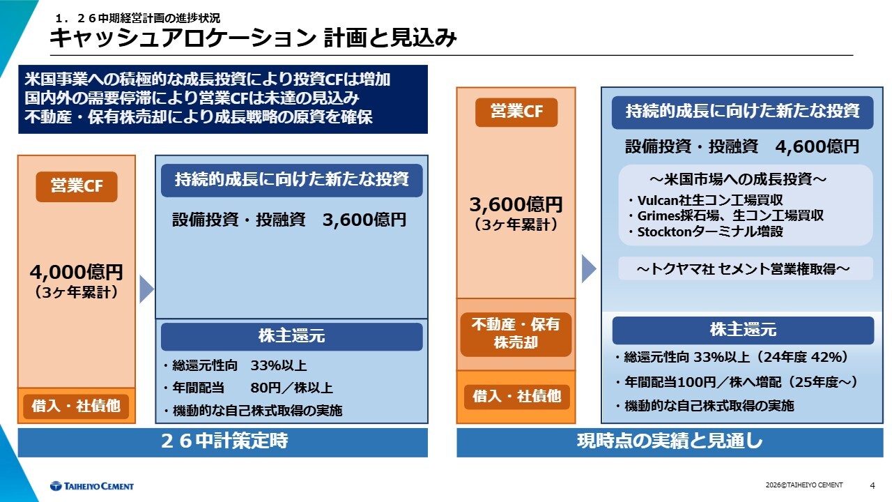 特に成長投資が先行しています。投資はタイミングが重要であり、機を逃さずに実行した結果です。主な投資としては、米国市場における成長投資として、Vulcan Materials社の生コンクリート工場の買収やGrimes Rock社の採石場への投資を行いました。