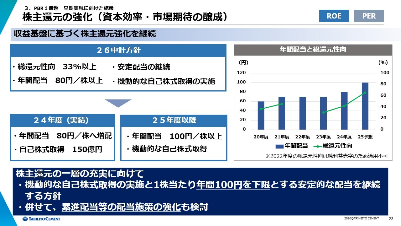 株主還元の強化についてです。2025年度の実績として、当初予定していた1株当たり年間配当80円から、100円に増配しました。