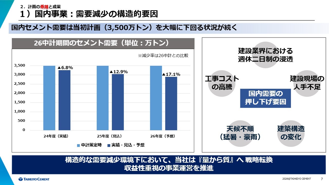 国内事業の需要減少は、当初の想定から大きくずれる結果となっています。当初は、国内事業の需要は3,500万トンの水準を3年間継続すると見込んでいました。