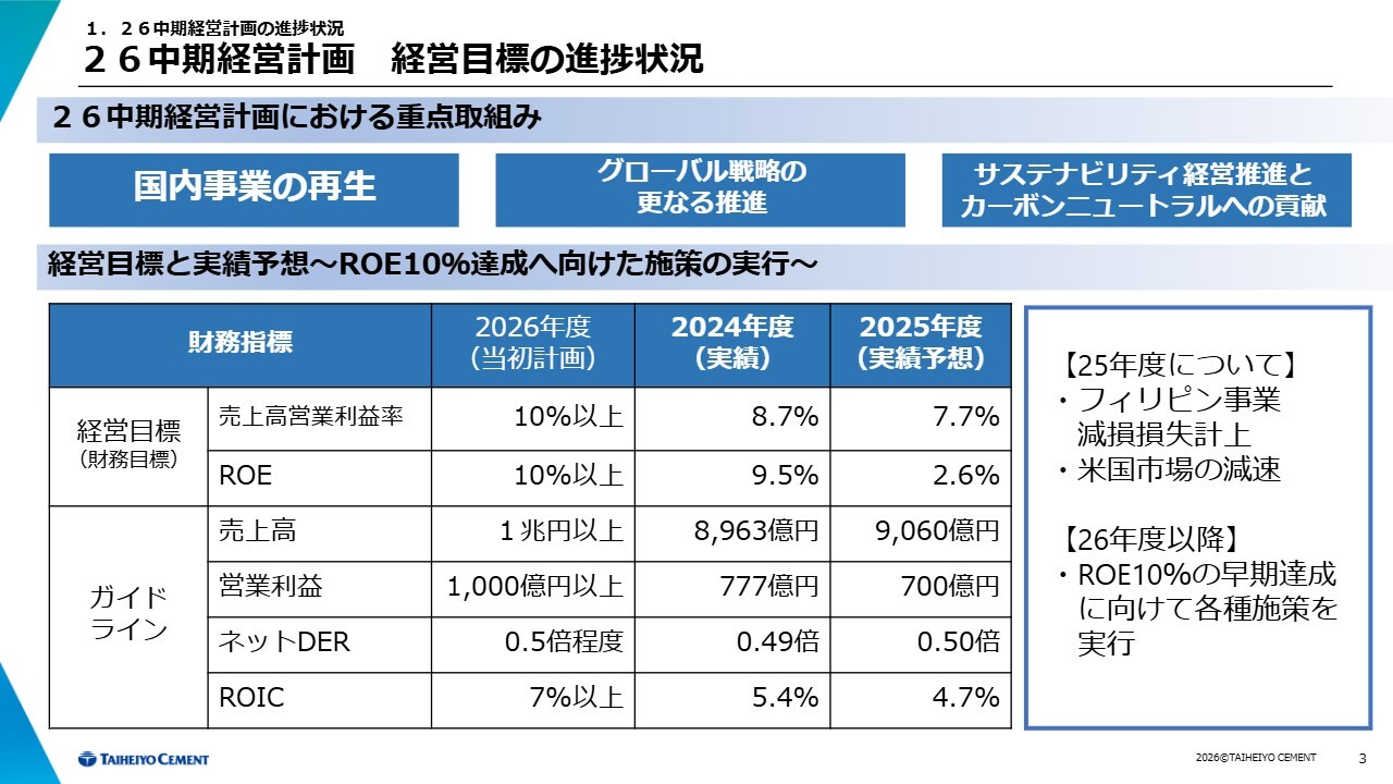 26中期経営計画の進捗状況です。当社は26中期経営計画において、大きな目標として「国内事業の再生」「グローバル戦略のさらなる推進」「サステナビリティ経営推進とカーボンニュートラルへの貢献」という3つの重点取組みを掲げています。