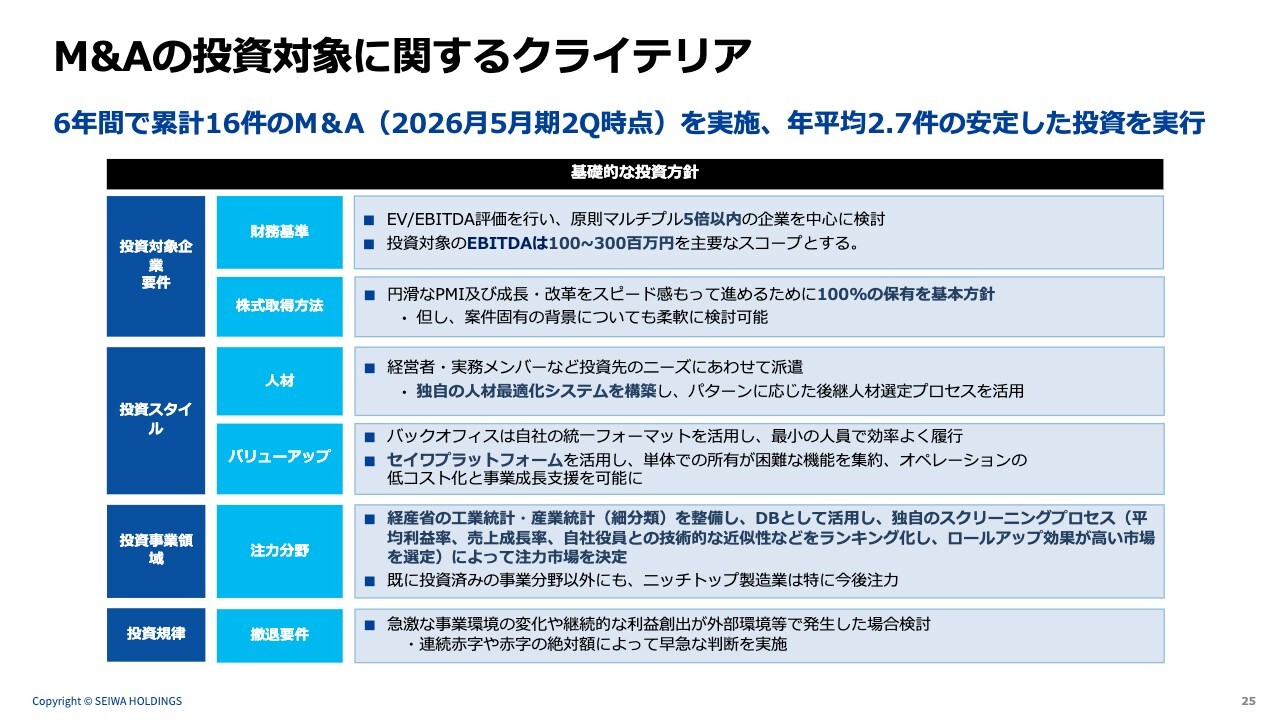 質問者:撤退基準についてうかがいます。原則は撤退しない前提で、撤退基準を設けて取り組んでいるとご説明がありました。これまで16社のM&Aを実施され、現在のグループ企業は14社ですが、すでにこの撤退基準に基