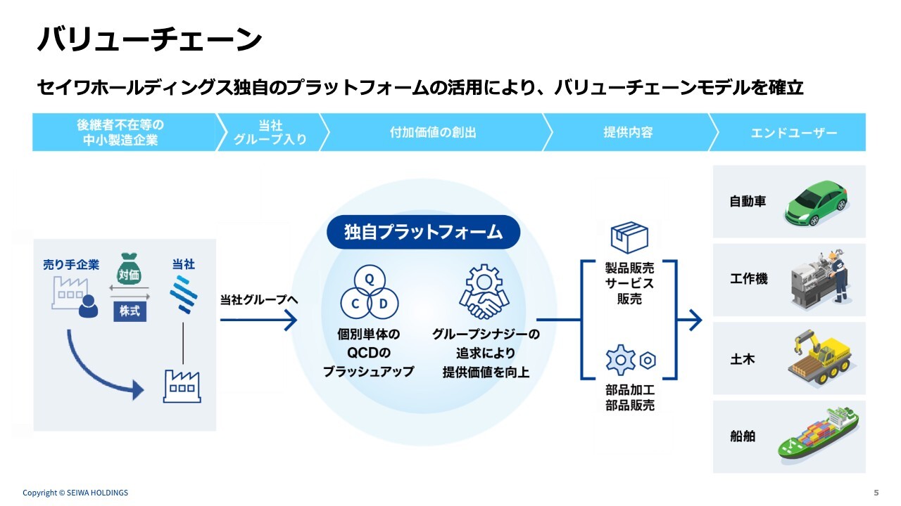 後継者不在などの中小製造企業の株式を譲り受け、自社独自のプラットフォーム内でグループ会社単体での成長を図ります。さらに周辺のM&Aを繰り返すことでグループ間のシナジーを最大限に発揮し、エンドユーザーに対して販売を行っています。