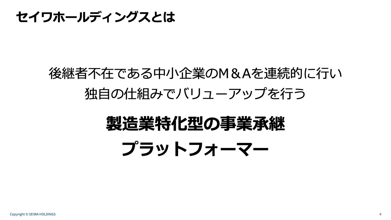 当社は後継者不在である中小企業のM&Aを連続的に行い、独自の仕組みでバリューアップを行う、製造業特化型の事業承継プラットフォーマーです。