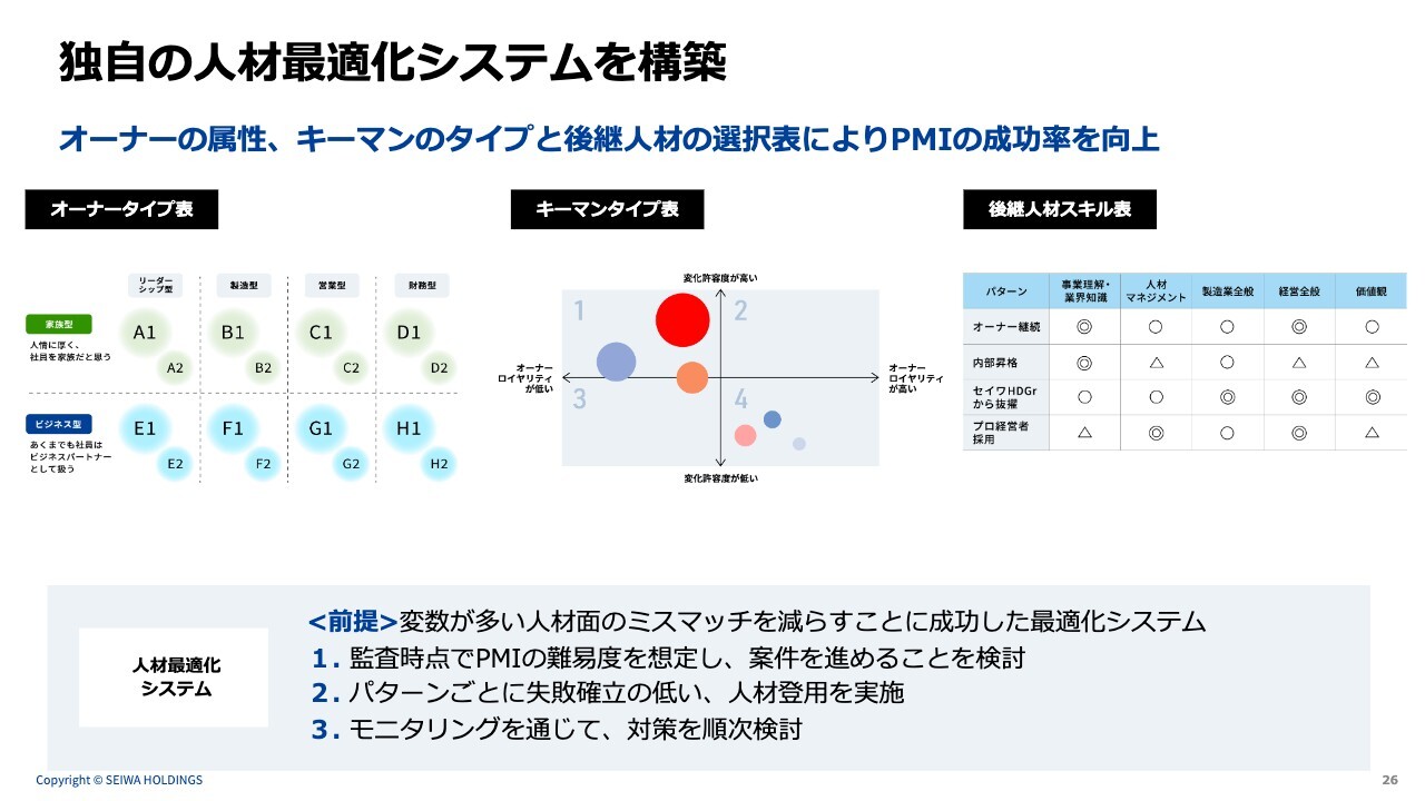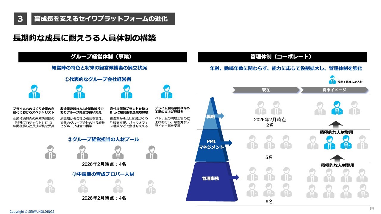 スライド左側に「②グループ経営担当の人材プール」と記載しています。この4名は新たに企業がグループに加わった瞬間に社長を務められるような人材です。当社内で抱えている人材であり、横断的にプロジェクトを担当しています。