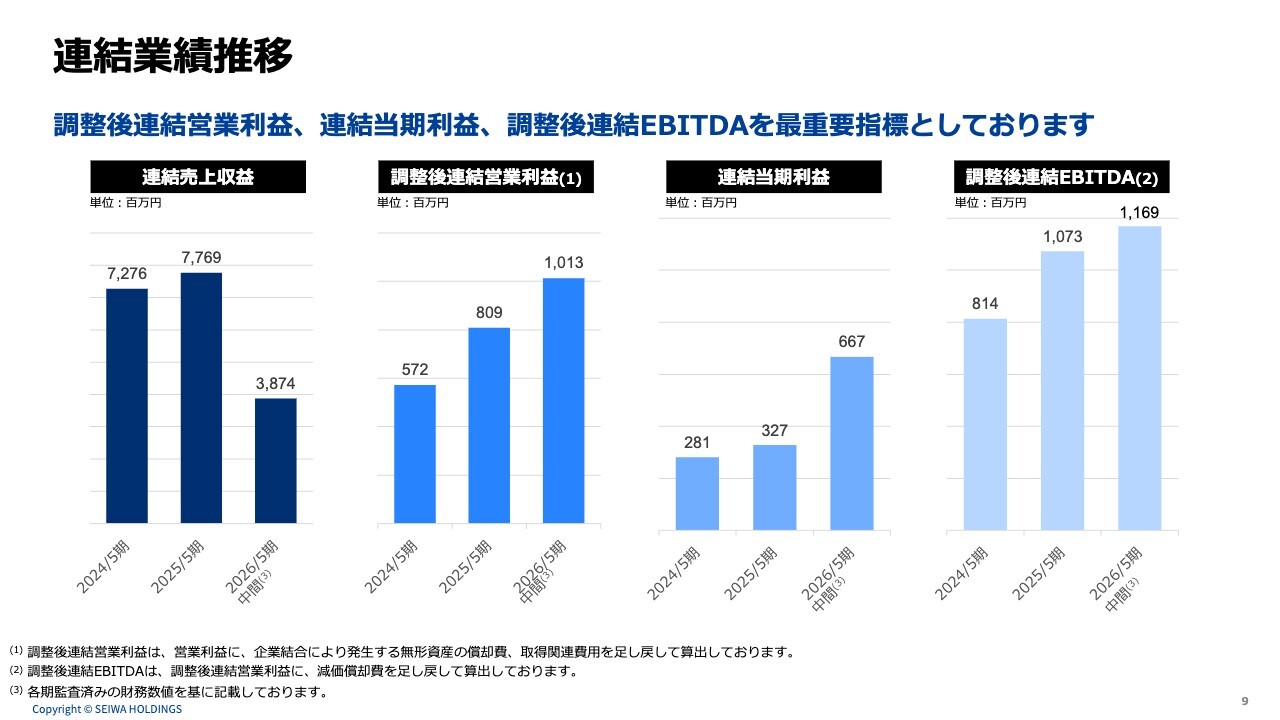 連結業績推移です。2026年5月期は半期の数字ではありますが、いずれの指標も前期を大幅に上回っています。