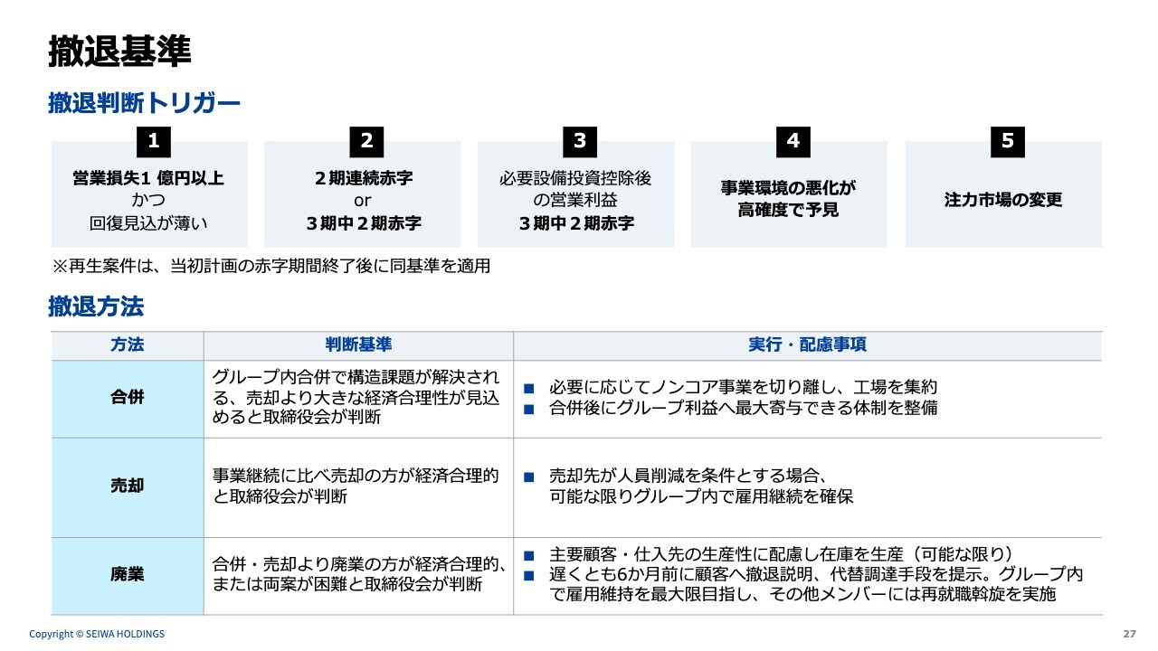 撤退基準です。原則として当社は撤退しない方針ですが、急激な環境変化などに対応するため、クライテリアを設けています。