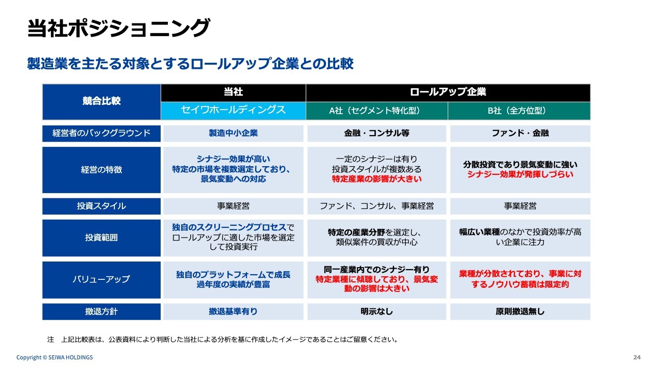 当社のポジショニングです。スライドには、他のロールアップ企業との比較を記載しています。