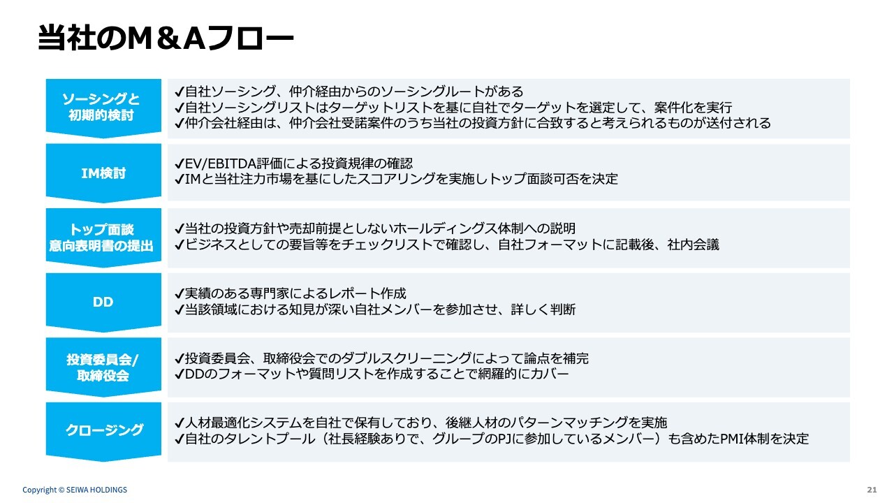 当社のM&Aフローです。一般的な検討の形式に比較的近い内容ですが、IM検討ではEV/EBITDA評価を用い、キャッシュフローを基にした指標で企業価値を評価しています。