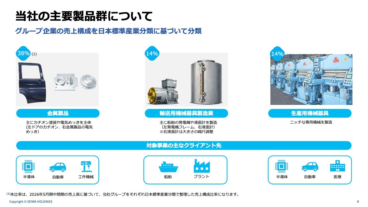 当社の主要製品群です。こちらは売上を基に日本標準産業分類に基づいて分類したものです。金属製品が売上の大半を占めています。