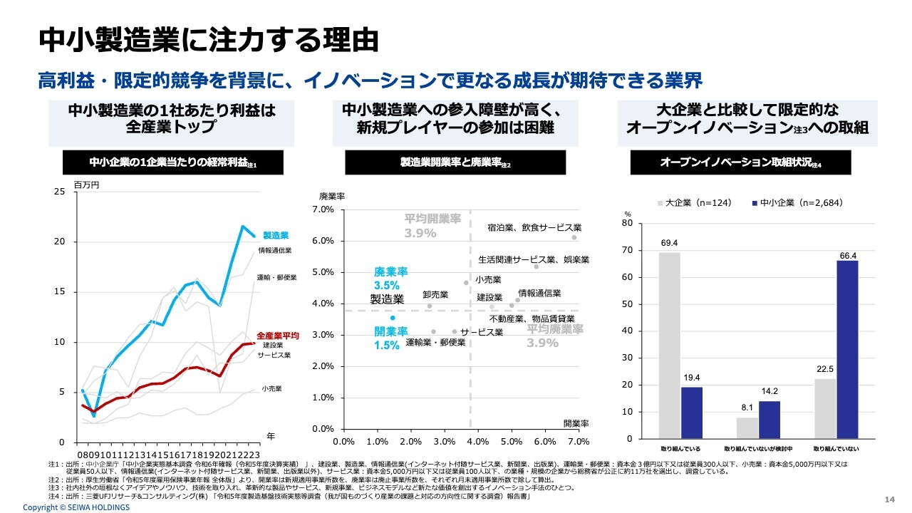 特に注目していただきたいのは、スライド中央のグラフです。全業種の平均開業率3.9パーセントに対し、製造業の開業率は1.5パーセントと、新規参入が難しく参入障壁の高い領域となっています。