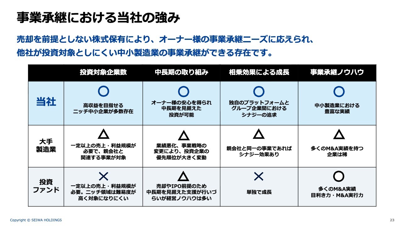 投資対象として、ファンドや大手製造業ではなかなか手を出せないようなニッチな製造業が多数あり、そのような分野をしっかりとカバーできている点が特徴です。さらに、中長期の取り組みとして、ファンドなどではイグジットの期間が決まっている場合が多いのに対し、当社では長期を見据えた投資が可能です。