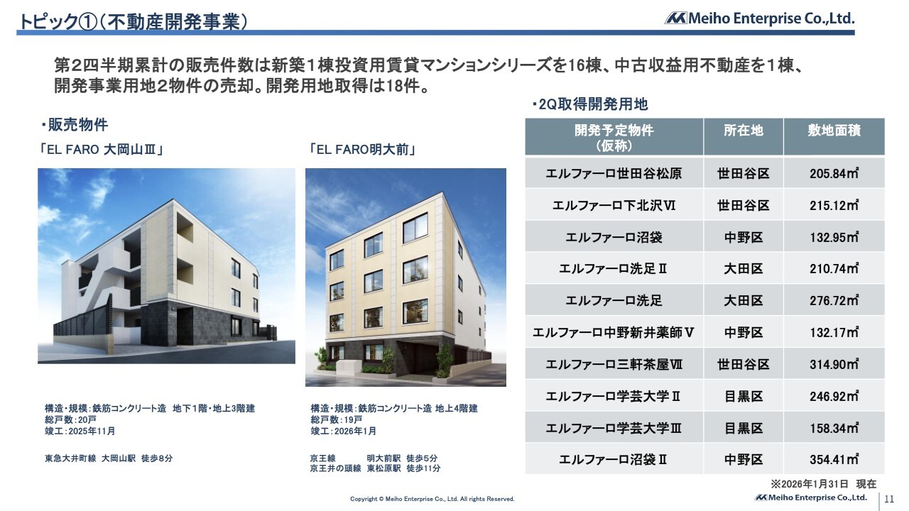トピックスとして当第2四半期で販売・取得した物件をご紹介します。1点目は、不動産開発事業における販売および仕入実績についてです。