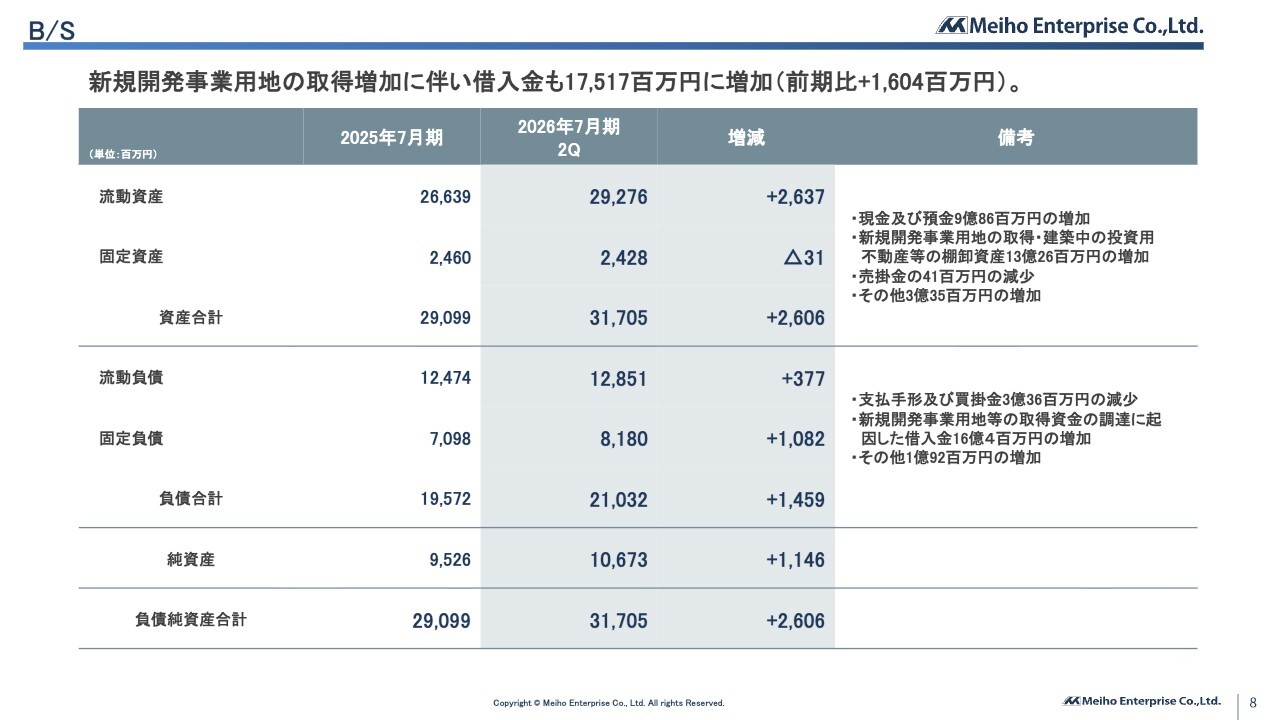 貸借対照表の増減分析です。新規開発事業用地の取得に伴う借入金の増加により、資産合計は317億500万円、負債合計は210億3,200万円となりました。
