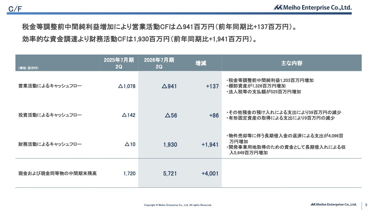 財務活動によるキャッシュ・フローは、先ほどお伝えしたとおり、開発事業用地取得のための資金として長期借入金による収入が56億4,900万円増加した結果、19億3,000万円の収入となりました。