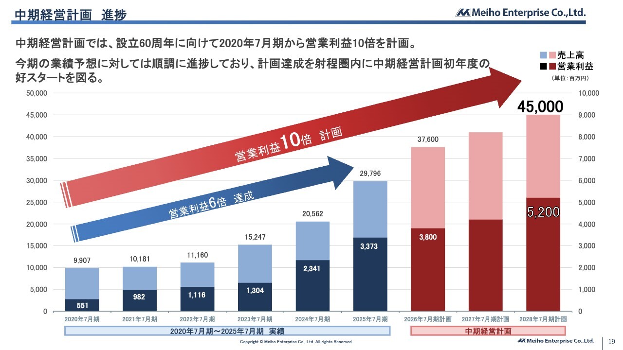 2025年9月11日に発表した中期経営計画で掲げた、2028年7月期の売上高450億円、営業利益52億円という目標の達成に向けて、確かな手応えを感じながら事業を進めています。引き続き安定した成長を実現し、今期計画および中期経営計画の実現に向けて着実に歩みを進めていきます。