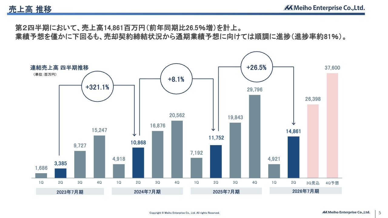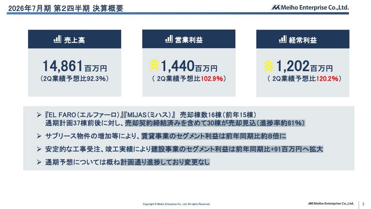 杉本圭司氏:みなさま、ご視聴いただきありがとうございます。株式会社明豊エンタープライズ執行役員事業企画室長の杉本圭司です。2026年7月期第2四半期の決算についてご報告します。どうぞよろしくお願いします。