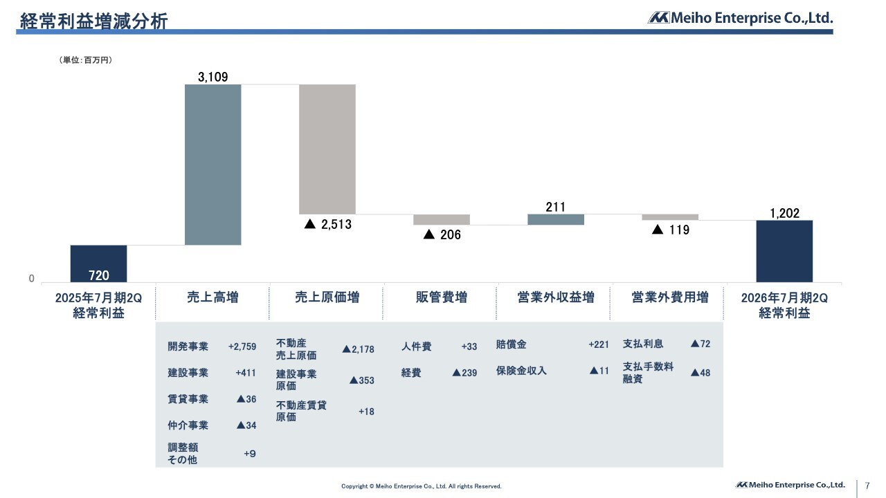 経常利益の増減分析です。引渡し棟数の増加に伴い、売上高および売上原価が増加した結果、第2四半期の経常利益は12億200万円となりました。