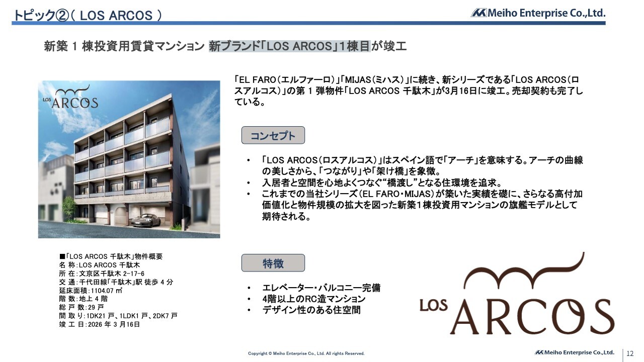 2点目は「LOS ARCOS(ロスアルコス)」の竣工についてです。「LOS ARCOS(ロスアルコス)」はスペイン語で「アーチ」を意味しています。コンセプトとして、アーチの曲線の美しさから、「つながり」や「架け橋」を象徴し、入居者の暮らしの橋渡しとなる住まいの提供を目指しています。