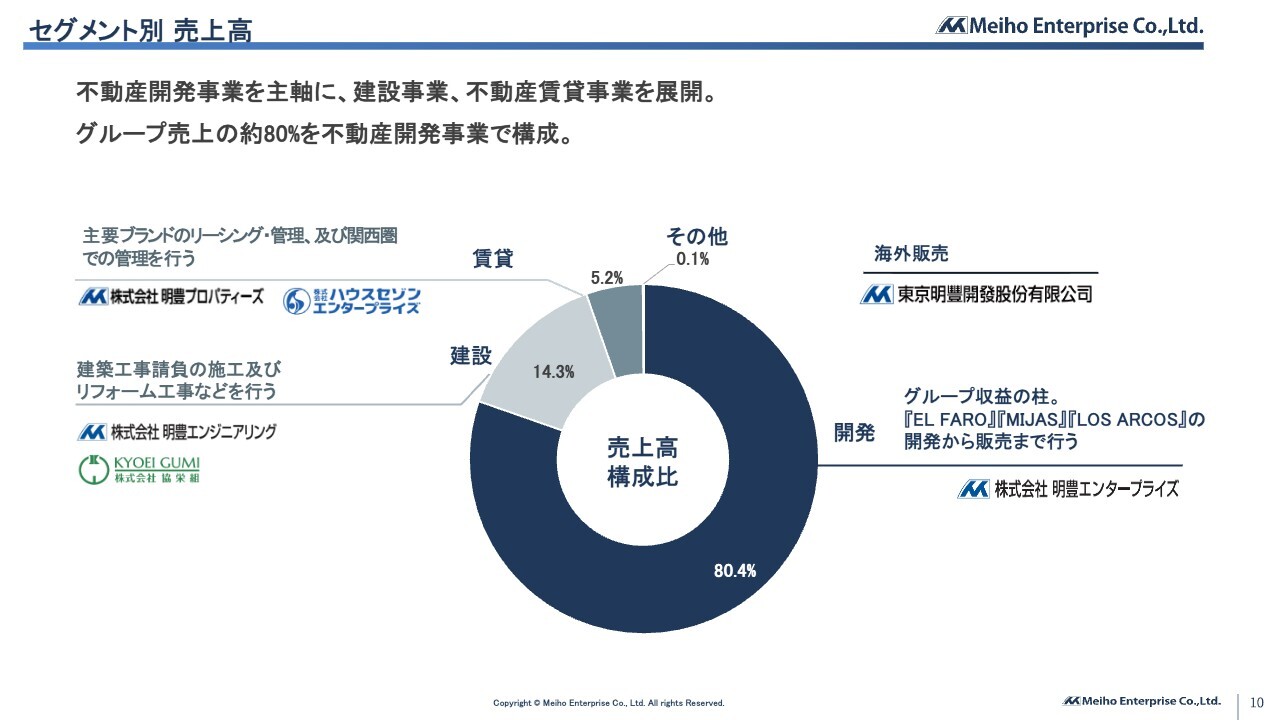 セグメント別の決算概要についてご説明します。当社グループは不動産開発事業を主軸に、建設事業、不動産賃貸事業、不動産仲介事業を展開しています。グループ売上の約80パーセントを不動産開発事業で構成しています。