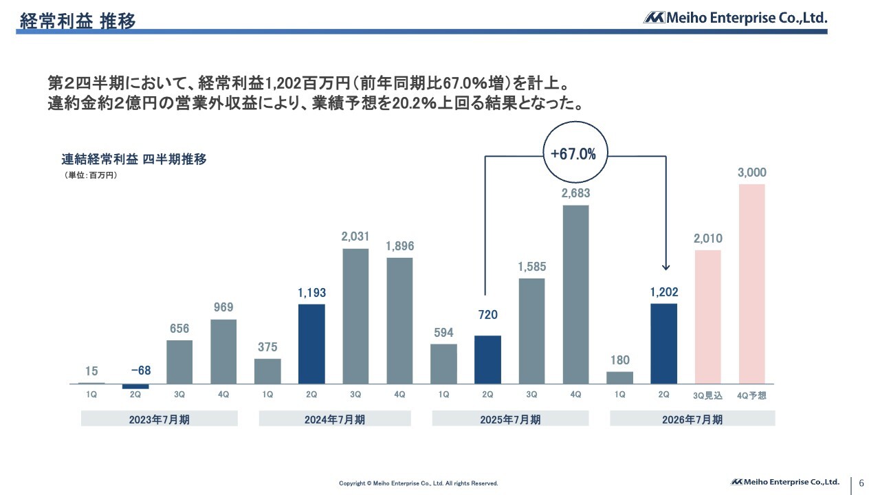まず、決算概要についてご説明します。2026年7月期第2四半期の売上高は148億6,100万円、営業利益は14億4,000万円、経常利益は12億200万円となり、おおむね期初計画どおりの進捗でスタートしています。
