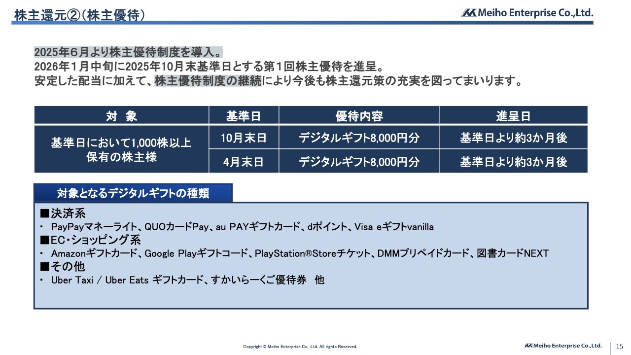 株主優待制度についてです。当社は2026年4月末日を基準日として株主優待を進呈しています。内容はデジタルギフト8,000円分で、10月末日の基準日と合わせて年間1万6,000円分をお受け取りいただけます。
