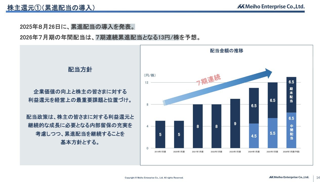 株主還元についてご説明します。当社は株主のみなさまへの安定的かつ継続的な還元を重視しており、2025年8月26日に累進配当制度の導入を決定しました。これは、減配を行わず、可能な限り配当の維持・引き上げを目指すという当社方針を明確化したものです。