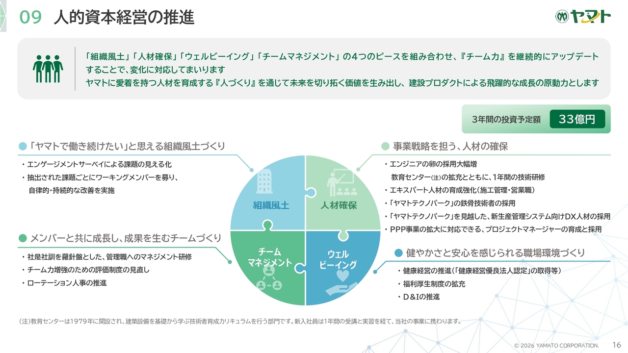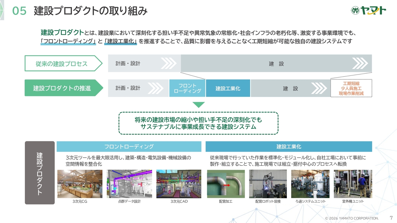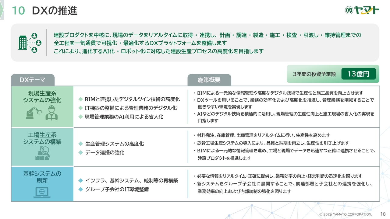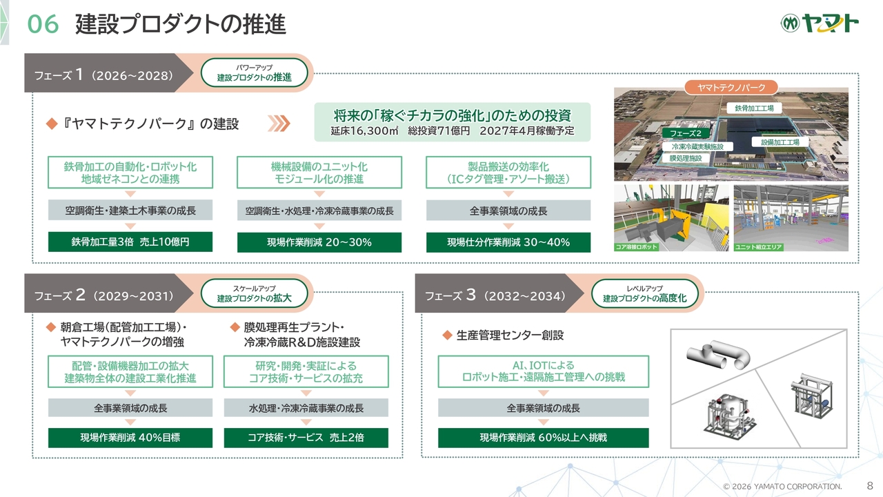 また、本中期経営計画期間中には、「ヤマトテクノパーク」を稼働させ、施工の工業化をさらに深化させるとともに、施工管理体制の構築、人材育成、DX投資にも積極的に取り組みます。