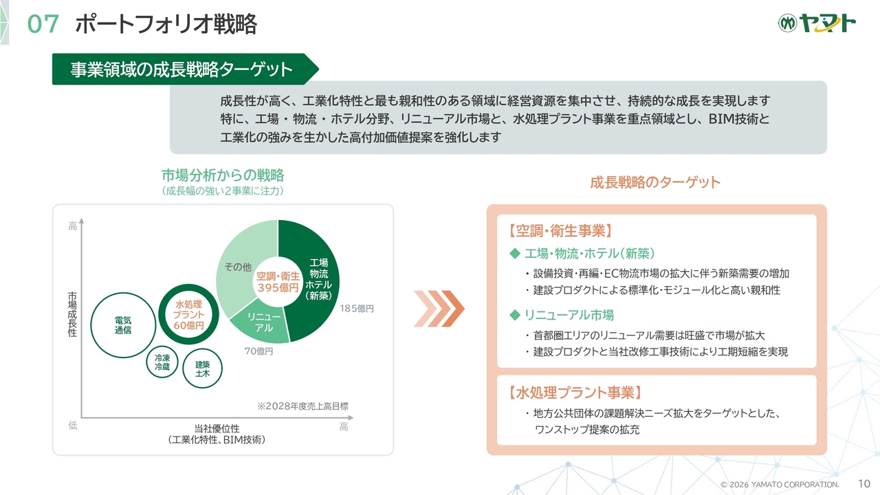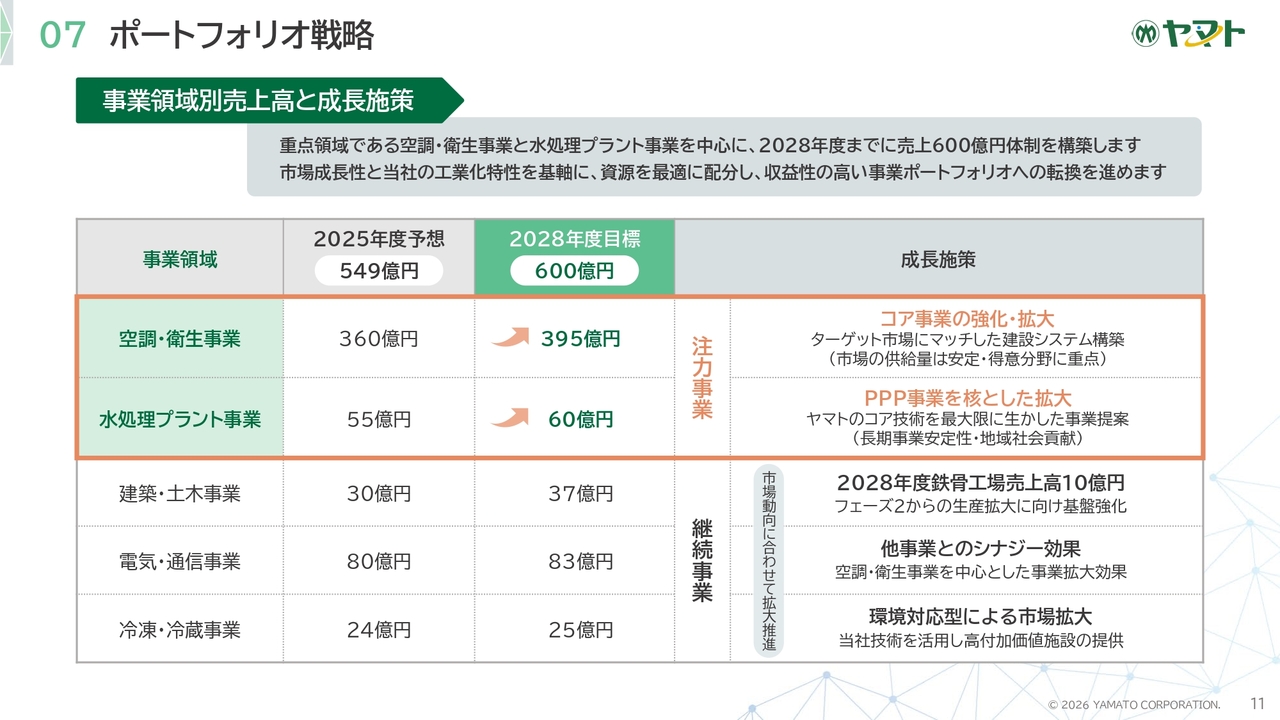 重点領域である空調・衛生事業および水処理プラント事業を中心に、2028年度までに売上高600億円体制の構築を目指します。市場成長性と当社の工業化特性を基軸に資源を最適に配分し、収益性の高い事業ポートフォリオへの転換を進めていきます。