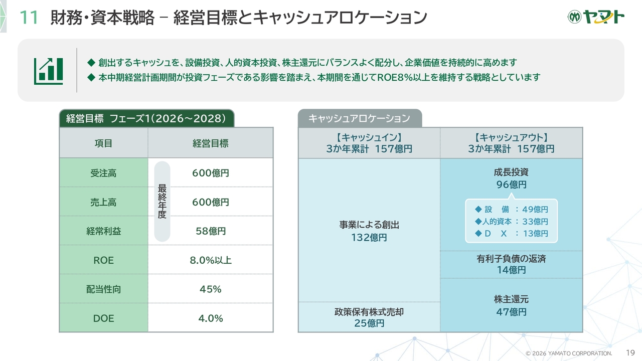 経営目標とキャッシュアロケーションについてご説明します。創出されるキャッシュを設備投資、人的資本投資、株主還元にバランスよく配分し、企業価値の持続的向上を図ります。本中期経営計画期間は投資フェーズであることから、この期間を通じてROE8パーセント以上を維持する戦略としています。