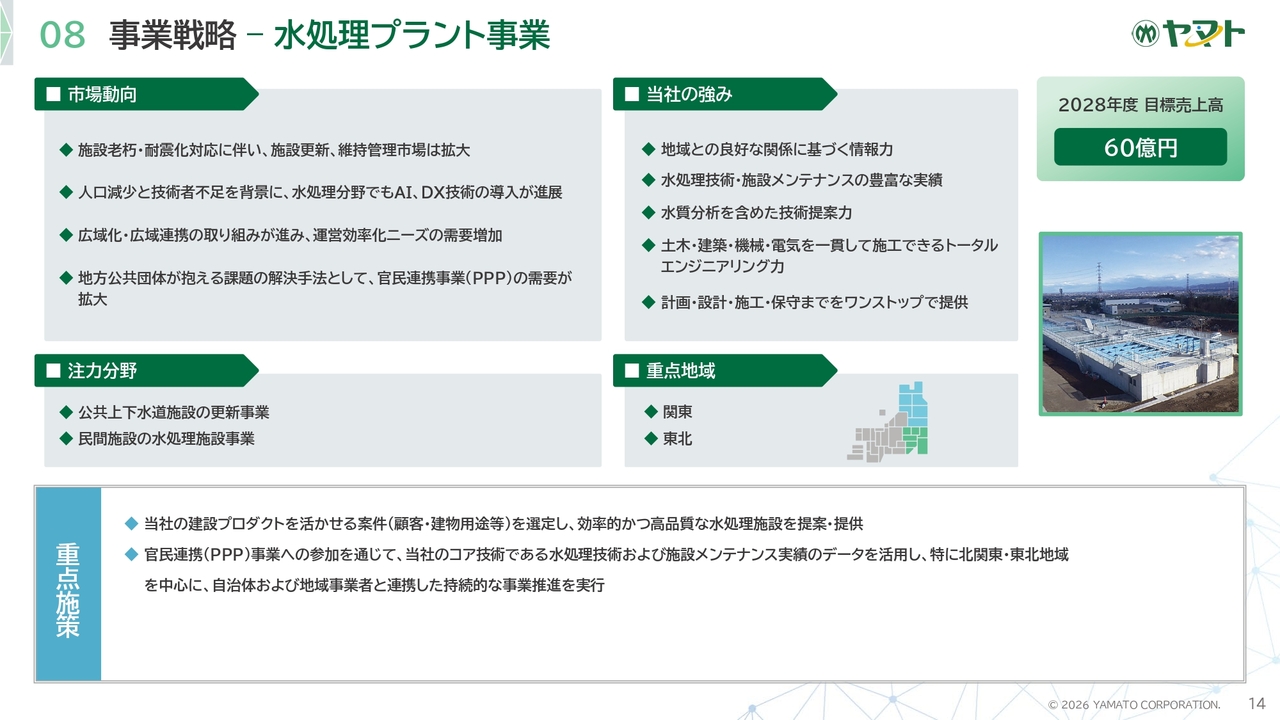 水処理プラント事業は、2028年度売上高60億円を目指します。成長施策は、PPP事業を核とした拡大であり、ヤマトのコア技術を最大限に活用した事業提案を推進します。