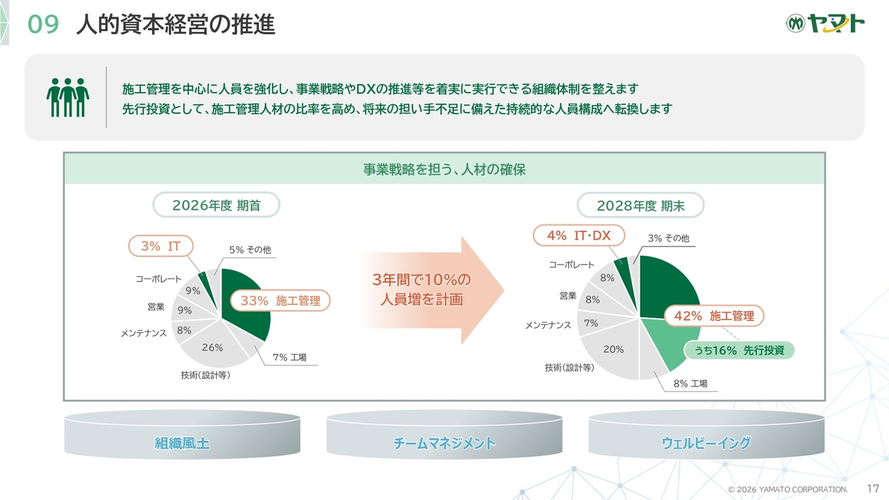 人的資本経営の推進についてご説明します。施工管理を中心に人員を強化し、事業戦略やDXの推進等を確実に実行できる組織体制を整備します。先行投資として施工管理人材の比率を高め、将来の担い手不足に備えた持続可能な人員構成へ転換します。3年間で10パーセントの人員増を計画しています。