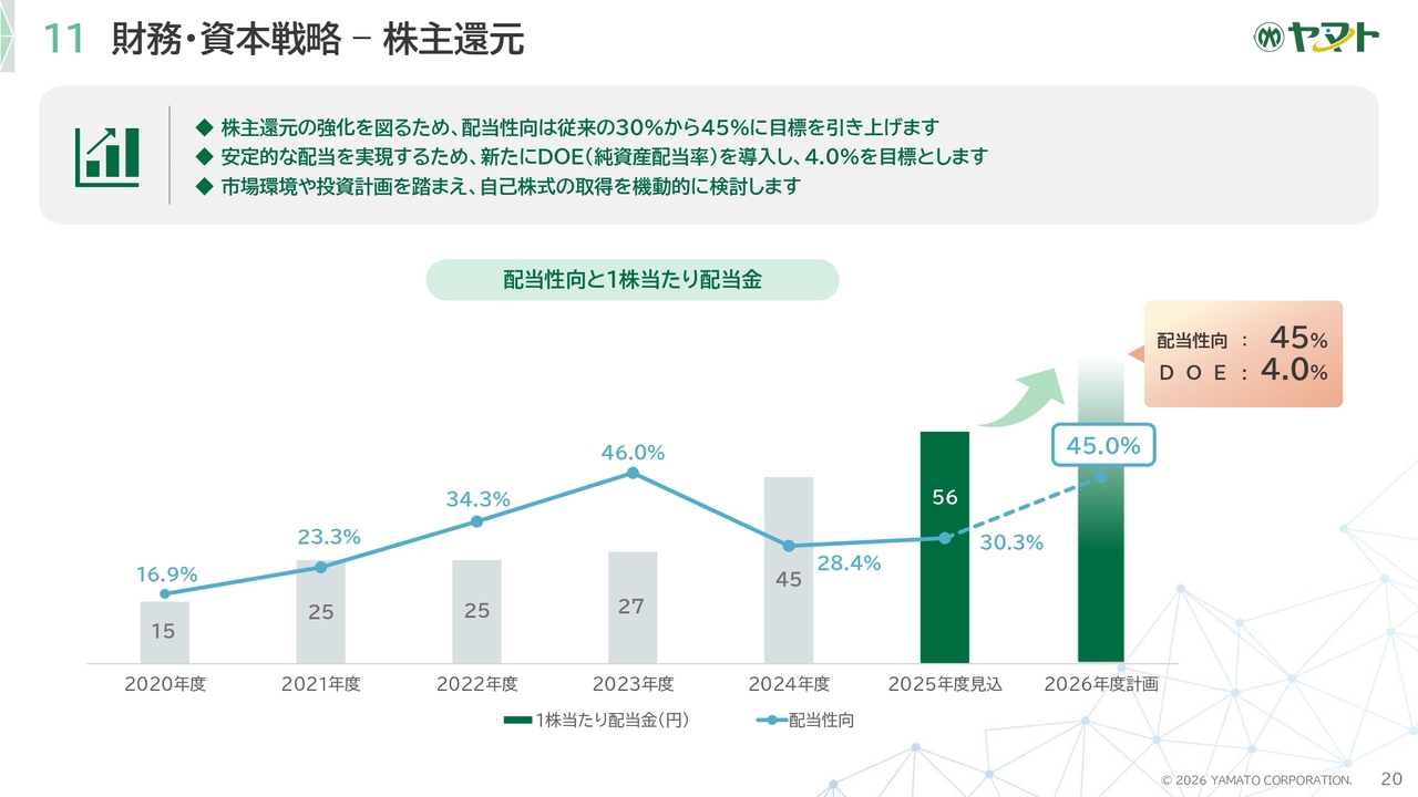 株主還元の強化についてご説明します。配当性向は従来の30パーセントから45パーセントに目標を引き上げます。また、安定的な配当実現のために新たにDOE(純資産配当率)を導入し、4.0パーセントを目標とします。市場環境や投資計画を考慮しながら、自己株式の取得を機動的に検討します。